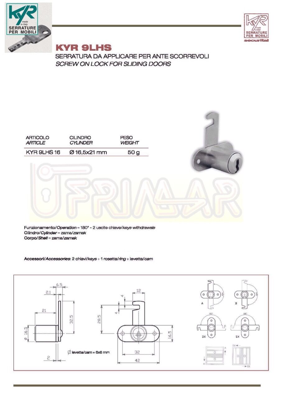 SERRATURA KYR ART.9LHS DA APPLICARE PER ANTE SCORREVOLI CIL.D.16,5 H.mm.21
